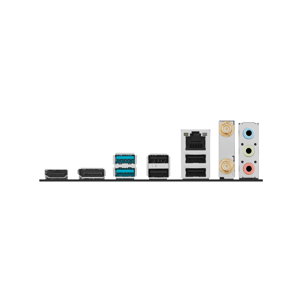 | Back Panel I/O | • 2× USB 10Gbps (Type-A) • 4× USB 2.0 (Type-A) • 1× DisplayPort • 1× HDMI™ • 1× Wi-Fi module • 1× Intel® 1Gb LAN • 3× Audio jacks |