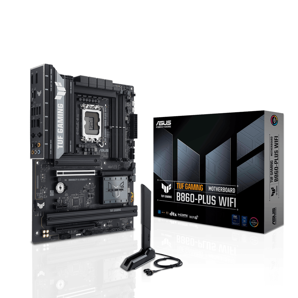 ASUS TUF GAMING B860-PLUS WIFI takes all the essential elements of the latest Intel® Core™ Ultra Processors (Series 2) processors and combines them with game-ready features and proven durability. Engineered with military-grade components, an upgraded power solution and a comprehensive cooling system, this motherboard goes beyond expectations with rock-solid and stable performance for marathon gaming. TUF GAMING motherboards also undergo rigorous endurance testing to ensure that they can handle conditions where others may fail. This platform delivers the power and connectivity that advanced AI PC applications demand.