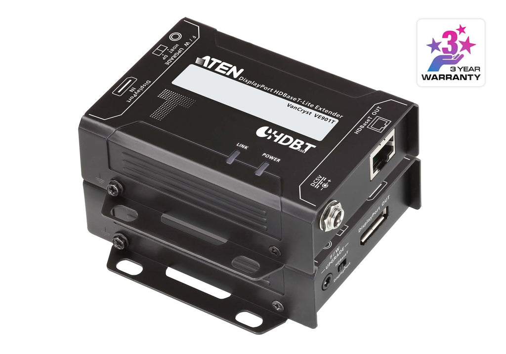 The VE901 DisplayPort HDBaseT-Lite Extender is the perfect solution for professional A/V installations that require video signal interference protection, such as in medical and military installations. With its lightweight and easy-to-mount design, and a slip-resistant DC Jack lock mechanism, the VE901 can be installed in a multitude of locations while ensuring peace of mind with its reliability.