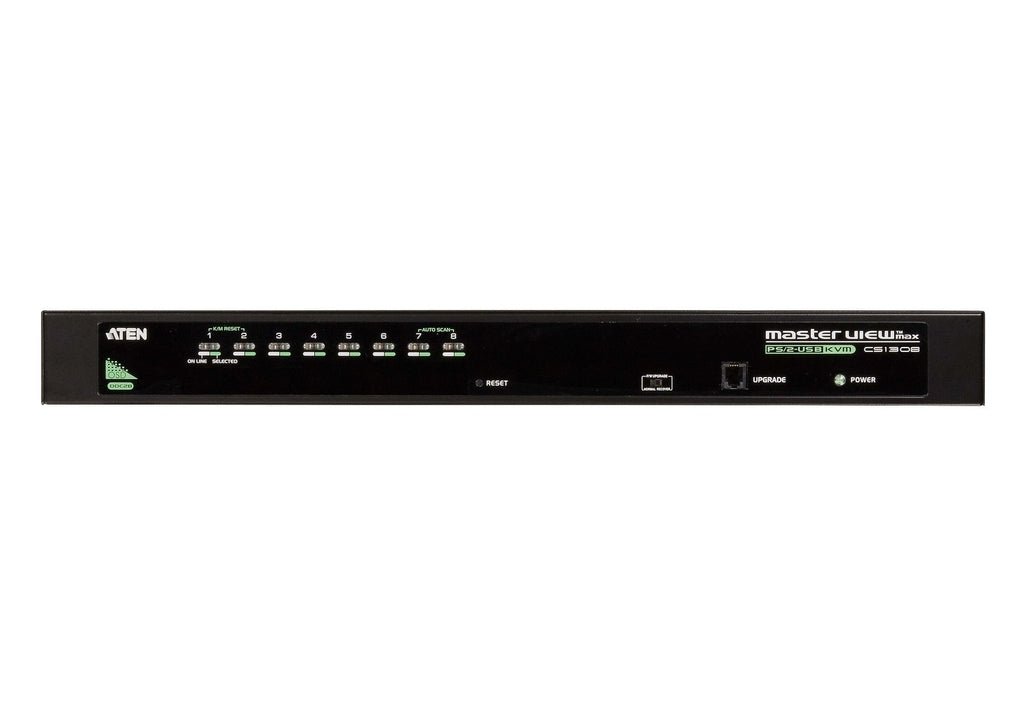 The CS1308 KVM switch allows access and control up to 64 computers from a single console (keyboard, mouse, and monitor). As many as 8 additional switches can be cascaded bringing the total number of connected computers to 64 computers that can be controlled from a single KVM console. The switch supports both USB and PS/2 connections for the console and computers.