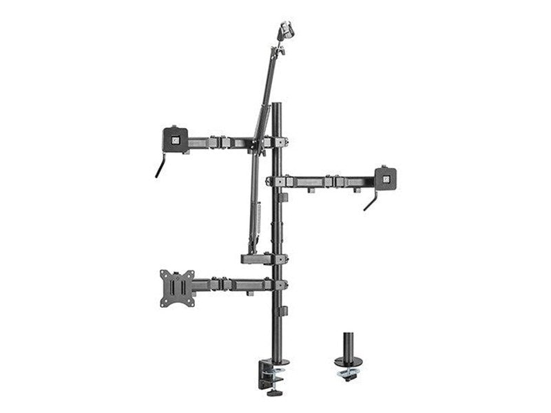 The MDS10-1 All-in-One Studio Setup Desktop Mount is the essential tool for YouTubers and other content creators. Using a single pole “to rule them all”, the user can create a tree of cameras, lighting, monitors, microphones and more. Made of strong steel, the pole and base confidently support all the equipment while the adjustable arms and accessories allow full range of motion. Two holders for attaching lights, cameras, ball heads or phone/tablet adapters with 1/4’’ and 3/8’’ screws. A positioning handle makes adjustments easy and without interruption during recording sessions. Two mounting options for microphones with the clamp unit are included in the package. The monitor arm fits 17″-32” screen and offer effortless tilt and swiveling to find the most comfortable and desirable viewing positions. Grommet & clamp mounts are included for installation on any table top surface.