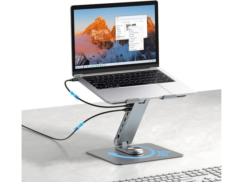 - Adjustable aluminium laptop stand with built-in USB-C docking station