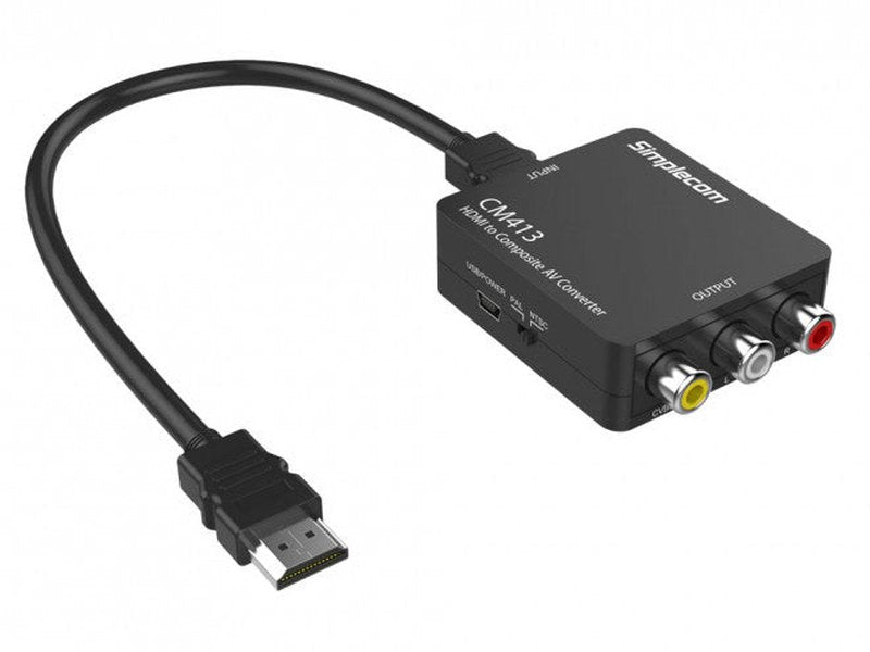 Simplecom CM413 HDMI to Composite AV Video Adapter converts the high definition HDMI digital video and audio signal to analog composite video and R/L audio output. It can be used for typical HD video sources, such as Laptop, Smartphone, Blu-ray Player, HD TV box, and Digital Media Receiver, etc. to a display with CVBS input, such as traditional CRT TV, RPTV and projectors.