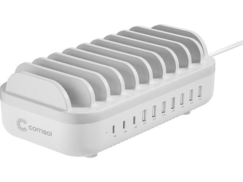 Introducing our Comsol 10 Port USB Charging Station, the ultimate solution to charging multiple devices at once! With a total power of 120W, this charging station can charge up to 10 devices simultaneously, including smartphones, tablets, and other USB-powered devices. Its sleek and compact design makes it a perfect fit for your office, while its smart power chip technology ensures that your devices are charged quickly and safely. With this charging station, you can say goodbye to multiple charging adapters, and hello to a more organised and efficient charging experience.