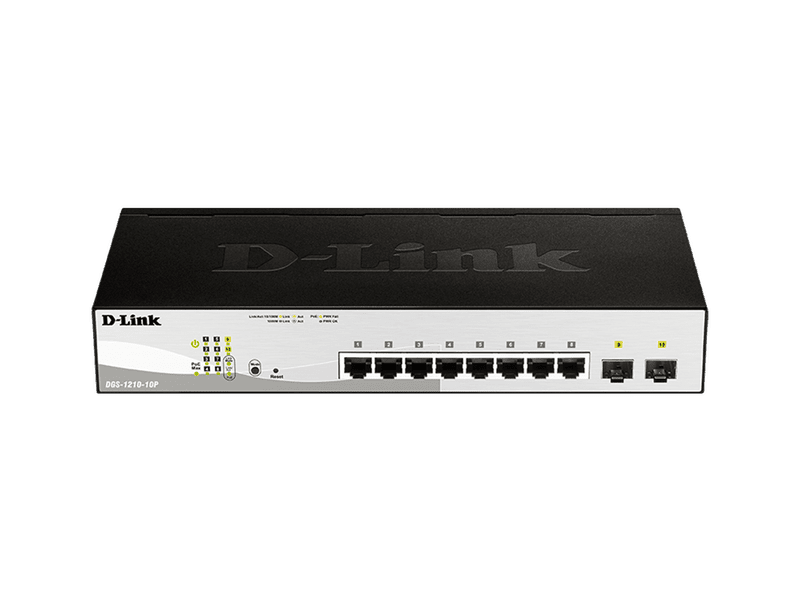 The D-Link DGS-1210 Series Smart Managed Switches are the latest generation of switches to provide increased Power over Ethernet (PoE) output, a range of physical interface types, multiple management interfaces, and advanced Layer 2 features. With all of these features combined, the DGS-1210 Series provides a cost-efficient and flexible solution for expanding any business network. The DGS-1210-10P comes with a fanless design in a compact 11” desktop enclosure, also offering a 19” rack mounting option with included mounting brackets. A fanless design allows for quiet operation and guarantees an extended lifetime.