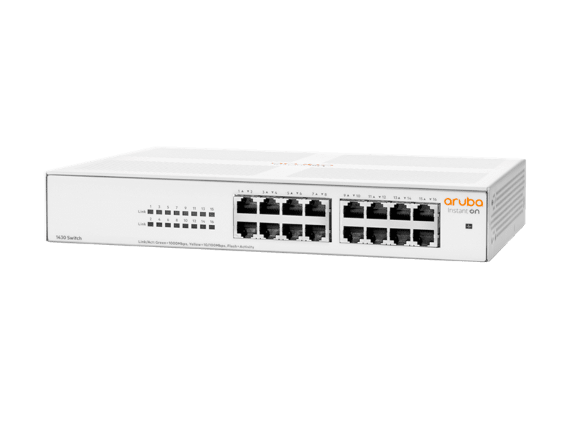 The Aruba Instant On 1430 Switch Series is an unmanaged Layer 2 Gigabit Ethernet switch series ready to deploy in seven models in PoE and non-PoE configurations: one (1) 5-port, two (2) 8-port, two (2) 16-port, one (1) 24-port, and one (1) 26-port model with 2 SFP uplinks models.