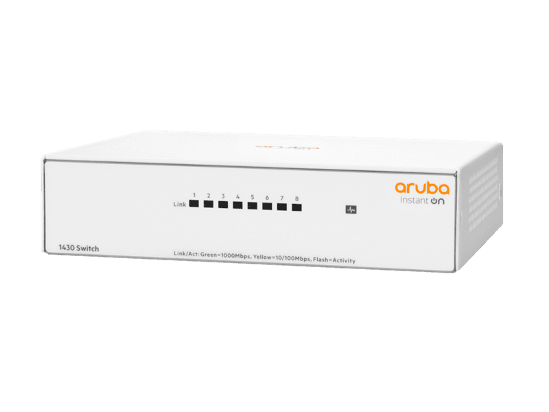 The Aruba Instant On 1430 Switch Series is an unmanaged Layer 2 Gigabit Ethernet switch series ready to deploy in seven models in PoE and non-PoE configurations: one (1) 5-port, two (2) 8-port, two (2) 16-port, one (1) 24-port, and one (1) 26-port model with 2 SFP uplinks models.