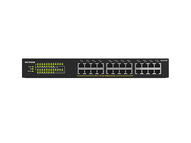 Introducing the NETGEAR GS324P 24-port Gigabit Ethernet Unmanaged PoE+ Switch with 190W PoE budget. Desktop and rackmount for flexible placement