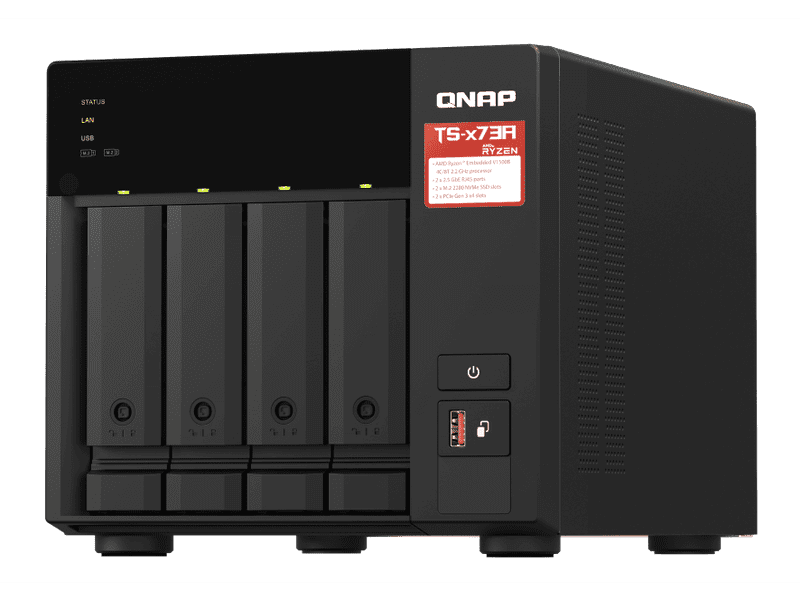 Featuring an AMD Ryzen™ V1000 series V1500B quad-core processor that delivers great system performance with up to quad-core / 8 threads and Turbo Core up to 2.2 GHz. The TS-473A features two 2.5GbE RJ45 ports and two PCIe Gen 3 slots for you to flexibly deploy 5GbE/10GbE networks. Two M.2 NVMe SSD slots for Qtier Technology and SSD Caching enable constant storage optimization. The TS-473A supports QTS and QuTS hero, allowing users to flexibly switch operating system based on their requirements.