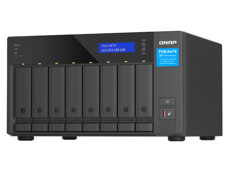 With an Intel® Core™ i5 six-core Processor to support the ZFS-based QuTS hero operating system, the TVS-h874 SMB NAS ensures data integrity and supports block-level inline data deduplication and compression, near-limitless snapshots, real-time SnapSync, and SSD optimization. Whether for mission-critical file servers, virtualization servers, collaborative video editing, or efficient data backup and recovery applications, the TVS-h874 delivers an ideal NAS solution. The high-performance TVS-h874 provides PCIe Gen 4 (up to twice the transmission speed of Gen 3) expandability, M.2 NVMe SSD caching, and 2.5GbE connectivity for high-speed virtualization network environments.