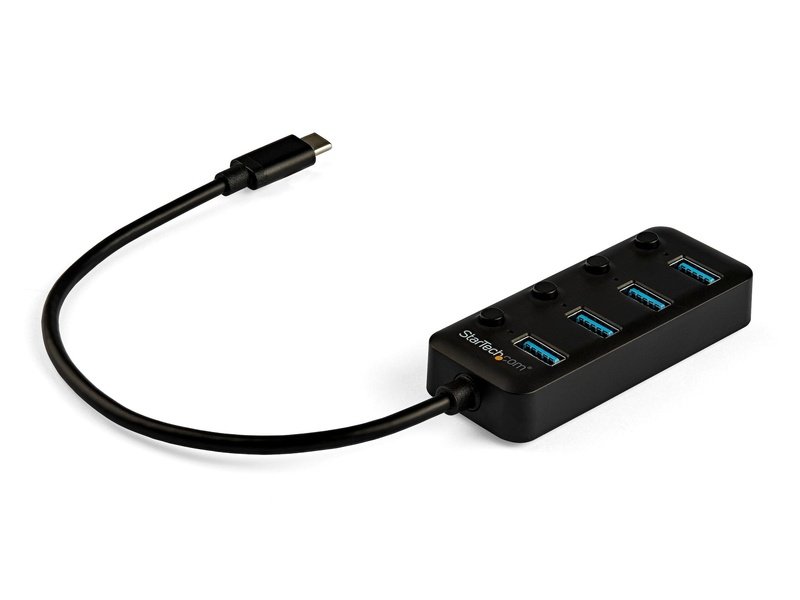 This portable USB-C™ hub gives you an easy way to add four USB 3.2 Gen 1 Type-A ports to your USB-C equipped laptop, tablet or smartphone, with individual power switches to conserve power. The USB-C to USB 3.2 Gen 1 hub plugs easily into your laptop’s USB Type-C™ or Thunderbolt™ 3 port. Plus, it’s bus-powered for easy portability.