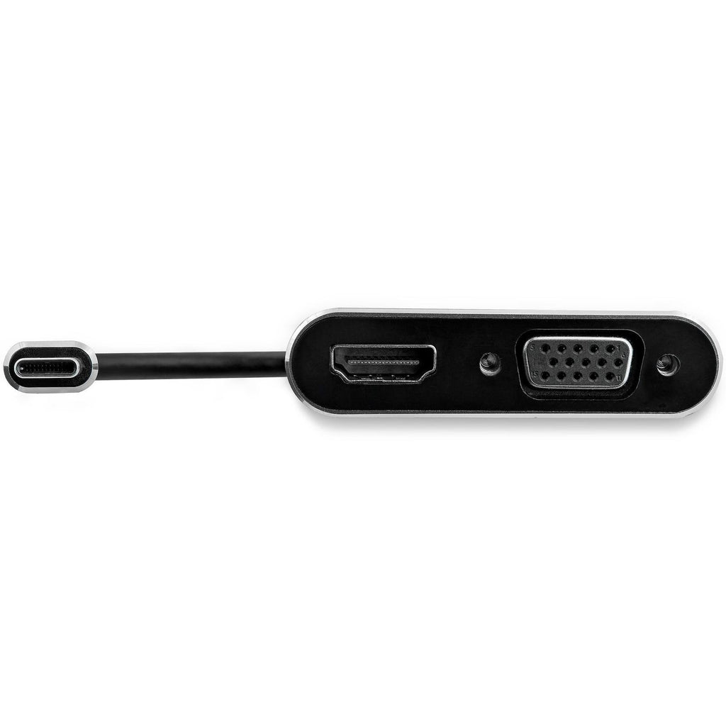 This USB-C to VGA and HDMI adapter offers a portable solution for connecting your USB Type-C laptop to a VGA or HDMI display. The multiport video adapter also works as a splitter, enabling you to simultaneously output an identical video signal to two separate monitors (1 x HDMI and 1 x VGA).