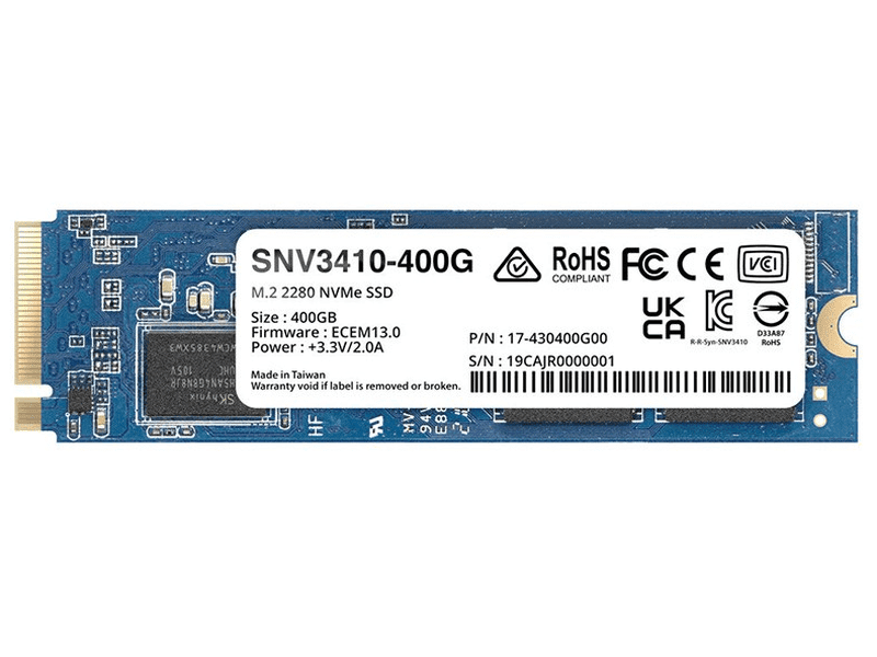 Synology SNV3410 M.2 NVMe SSD delivers 205,000 / 40,000 s sustained 4K random read/ write IOPS for demanding I/O.