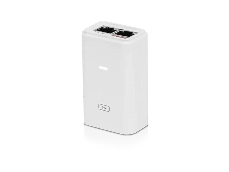 THE UBIQUITI POE-24-7W-G-WH POE ADAPTER (FOCUSES ON BENEFIT) COMBINES POWER AND PROTECTION IN WHITE.