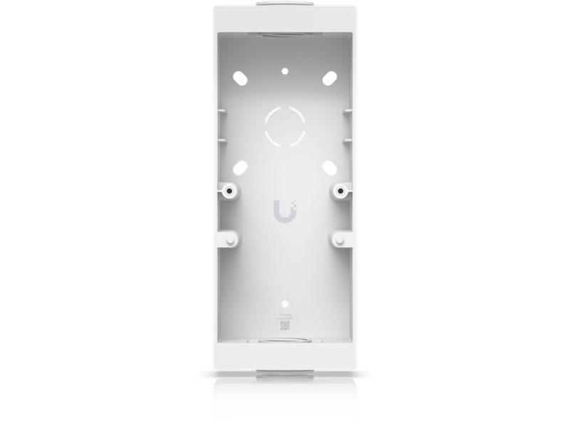 Junction box for UniFi Professional Access Readers and Doorbells that supports flat surface mounting and attachment to 3/4" conduit.
